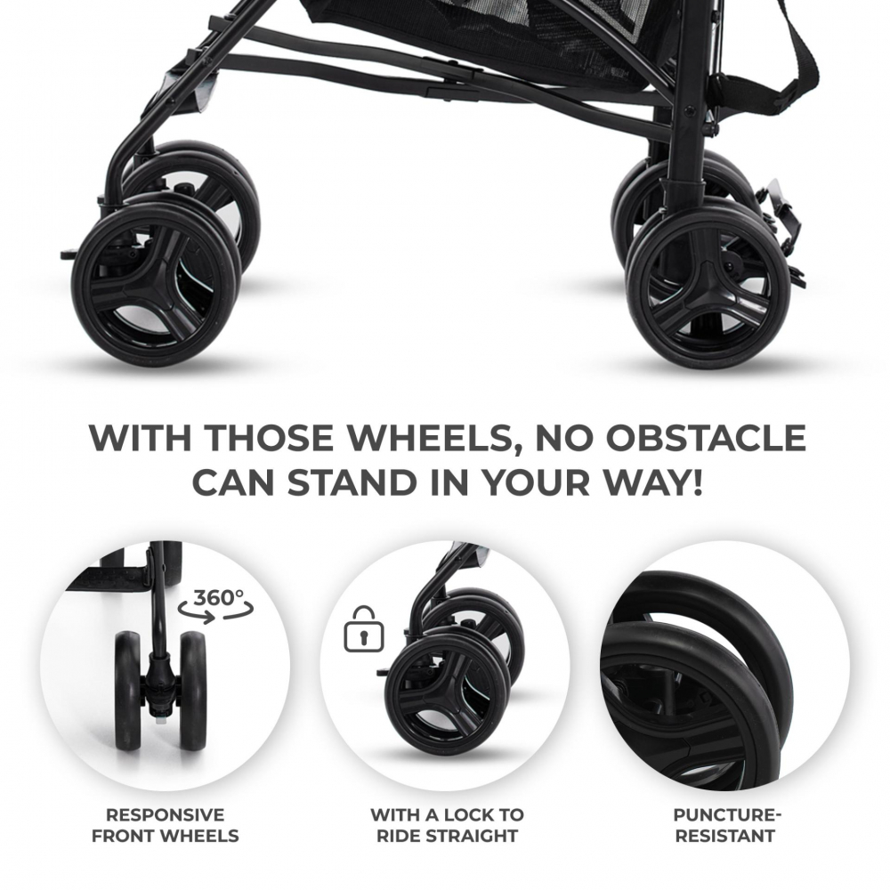 Nu trebuie sa pompati rotile usoare, rezistente la perforare si, daca este necesar, puteti bloca cele doua roti din fata pentru a circula pe terenuri mai dificile.