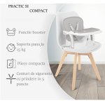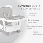 - Multifunctionalitate - Poate fi folosit ca scaun de hranire jos si dispune de o functie de inaltator pentru reglarea inaltimii.