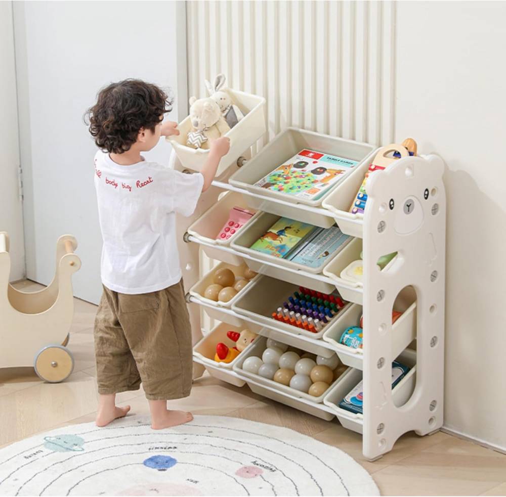 * Cel mai simpatic organizator cu 3 nivele, echipat cu 5 cutii mai mici si 2 cutii mari, perfecte pentru a-ti tine jucariile, jocurile, cartile si creioanele in ordine.