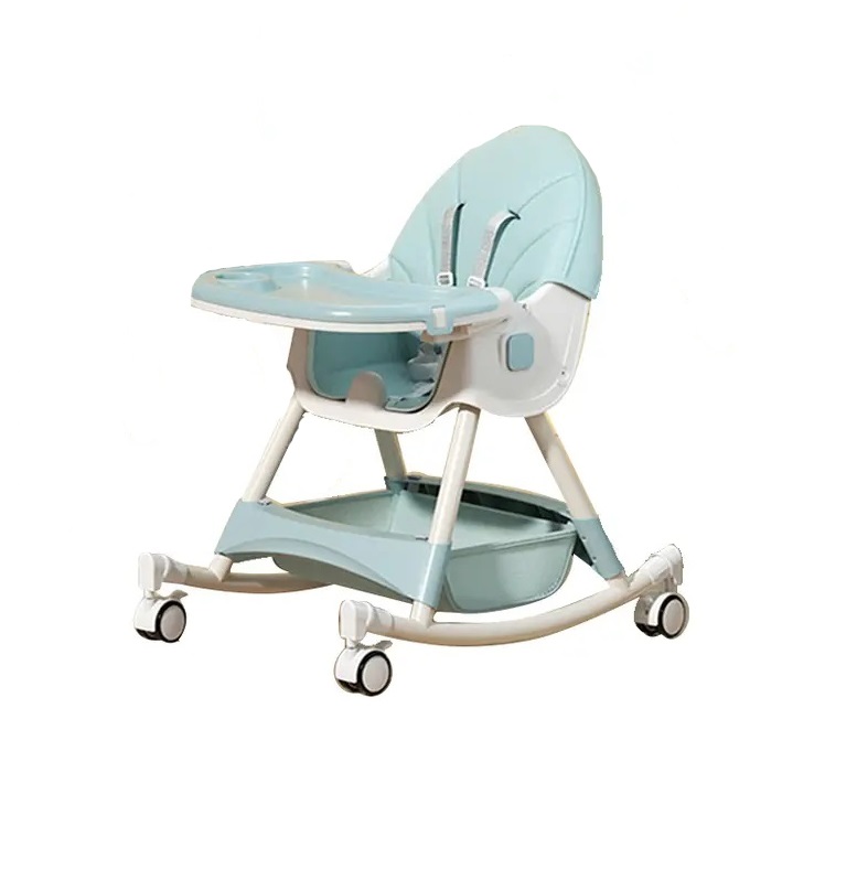 Scaun de masa pliabil pentru bebelusi Little Mom 3 in 1 Funny Light Green cu roti si functie de balansoar, multifunctional, centura de siguranta 5 Puncte, ajustabil pe inaltime, cos de depozitare, husa detasabila