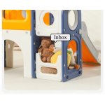 Spatiu de joaca pentru copii Nichiduta Garden blue/white, de interior/exterior, cu tobogan, leagan cu spatar, zona de tunel, platforma superioara, panou cu cos de baschet, dimensiune 248 x 152 x 110 cm